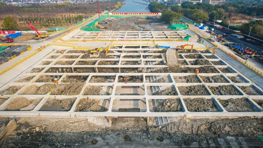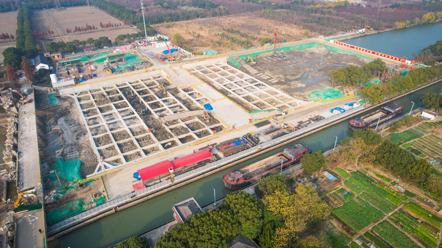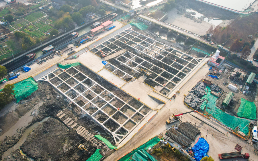 12月18日,松江区油墩港航运枢纽施工现场,建设者在施工。整个工程有序推进。
