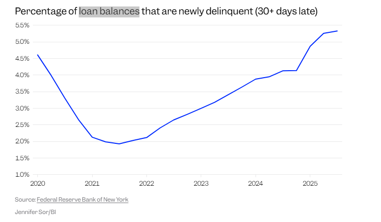 越来越多的贷款进入逾期还款状态。根据纽约联邦储备银行的数据,第三季度新增逾期贷款(即借款人逾期还款至少30天的贷款)余额上升5.3%。这是自2014年以来的最高新增逾期率。