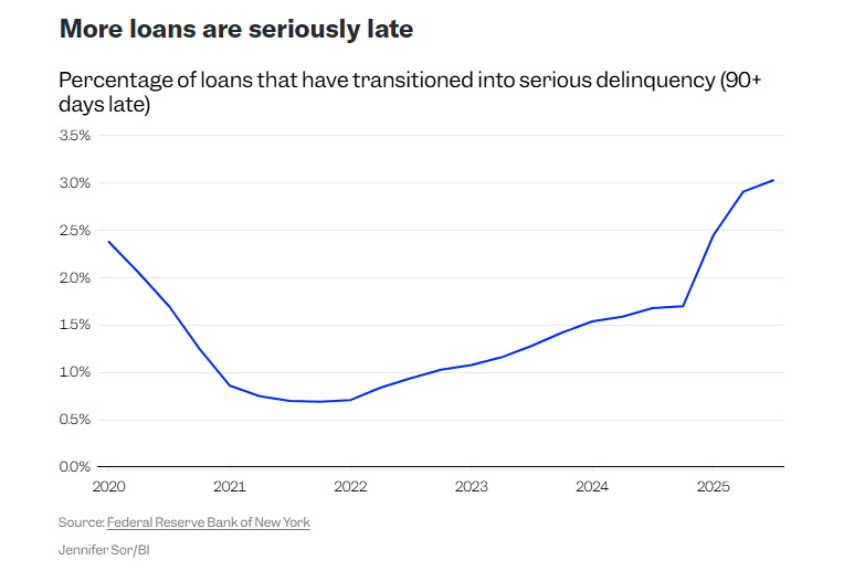 更多的消费者也陷入了所谓的“严重”拖欠,即贷款还款逾期90天或更长时间。数据显示,上季度转为严重拖欠的贷款比例上升至3%,也是十多年来的最高水平。