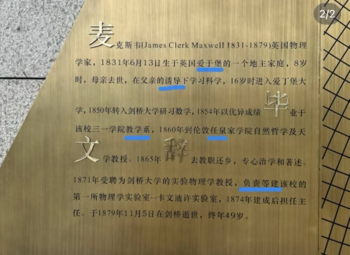 极目新闻记者检索发现,关于麦克斯韦的简介,网上版本比较多,被曝光的这块展板上内容与2006年一位网友的文章高度相似,但网文中并无上述错别字。